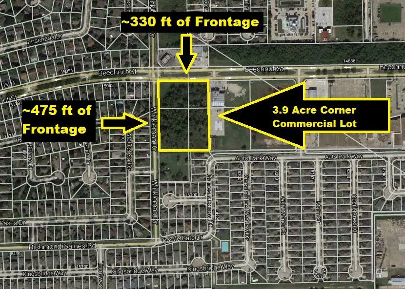 New Price! Highly Visible Commercial Corner Property at 4-way stop on the corner of Beechnut St & Winkleman Rd/Gains South just off Hwy 6 & Westpark Tollway. Property has 330 feet of frontage on Beechnut Street and 475 feet of frontage on Winkleman Rd/Gains South. Property consists of 4 Parcels totaling 3.9007 acres. Owner Will Consider Financing! Great Investment Opportunity & perfect for Church, Daycare Center, Convenience Store, Restaurant, Retail, etc. Near George Bush Park and Grand Parkway.