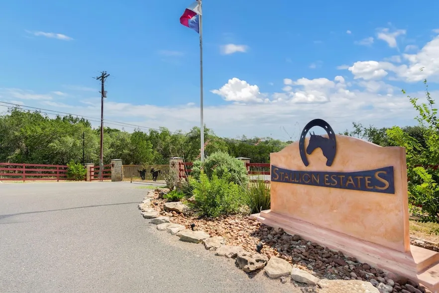 Sweeping long range views of the Texas Hill County on this 3.90 acre lot in the desired gated community of Stallion Estates. Build site is naturally elevated on the top side of a large hill. Driveway and build site cleared. Beautiful site to build your dream home with lots trees . True peaceful country living out here. This property has a gate and is partially fenced. Really is a must see. Water connection on Site. Fiber available