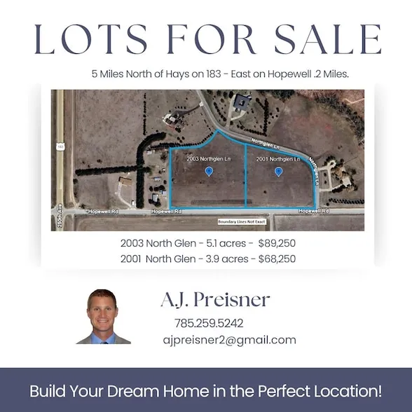 Build Your Dream Home in the Perfect Location! This 3.9-acre lot in Little Creek Estates just 5 miles north of town offers the perfect setting for your custom home and dream garage. Enjoy peaceful country living with the convenience of being close to town. With plenty of space, beautiful surroundings, and residential-only use, this property is ready for you to craft your ideal home or getaway. Rural water is available through Trego County Rural Water (meter purchased separately), and the seller is offering a $5,000 allowance at closing towards bringing water to the property. Don t miss this opportunity schedule a visit today! Call A. J. Preisner with Platinum Group at 785.259.5242.