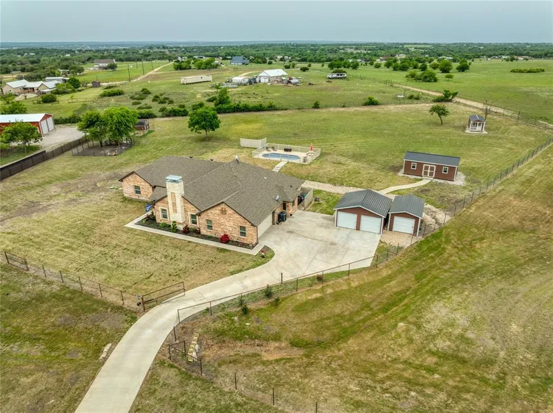 Welcome to your own private retreat! Nestled on nearly 4 acres in a peaceful cul-de-sac, this immaculate home offers the perfect blend of comfort, space & functionality‹”with amenities that are sure to impress. Step inside to a spacious open-concept living area, ideal for entertaining. You'll love the soaring ceilings with a striking beam accent, beautifully stained concrete floors, decorative lighting & a stunning ventless stone fireplace with gas logs (also convertible to wood-burning). The oversized dining area flows seamlessly into a chef's kitchen, featuring gleaming granite countertops, a large breakfast bar, an abundance of cabinetry, stainless steel appliances including a double oven & a walk-in pantry that's sure to delight. The generous primary suite offers a serene retreat, complete with a cozy sitting area, dual granite-topped vanities, a luxurious soaking tub, separate walk-in shower & a spacious walk-in closet. Three additional bedrooms are thoughtfully split from the primary suite to offer privacy for everyone. A well-appointed utility room includes ample cabinetry, granite counter space, a sink, full size washer dryer space & room for extra appliances. Step outside to your own backyard oasis! Cool off in the fully fenced pool‹”perfect for summer gatherings‹”or unwind on the covered back porch. The attached two-car garage is complemented by two additional metal garages, one equipped with a remote opener, providing extra covered parking or workshop space. Storage abounds with four additional sheds‹”one of which is currently used as a charming chicken coop. The entire property is fully fenced & cross-fenced with two electric gates for added convenience & security. Additional highlights include a sprinkler system, an aerobic septic system, a private well, & a water softener‹”making this property as practical as it is beautiful. Updates include a new double oven & microwave. With no HOA, you have the freedom to bring farm animals, run a home business & more!