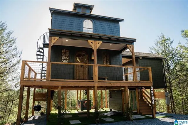 Escape and unwind in your very own TREEHOUSE ON LAKE MITCHELL!!!! 2023 New Build in a gated community has thought of everything to make your home, 2nd home, or income producing rental property a place of joy, relaxation, and peace. This very unique treehouse features a main house with a full high-end kitchen,full bath; and a separate bedroom accessed by a covered walkway. An enchanting spiral staircase takes you to the 2nd floor porch which opens up for a fully immersed view of breathtaking sunsets on the lake. Enjoy a living space under the house with a TV, custom-made bed swing, & an outdoor double shower. The details make this even more special: Egyptian doors, old warehouse flooring, windows from a TN schoolhouse, and much more! The dock is private and you will feel like you are the only ones on the lake! The treehouse is located on a 1 acre lot, also included are 2 additional lots next door giving you complete privacy! Hosted on AIRBNB offering instant income. Sold furnished!