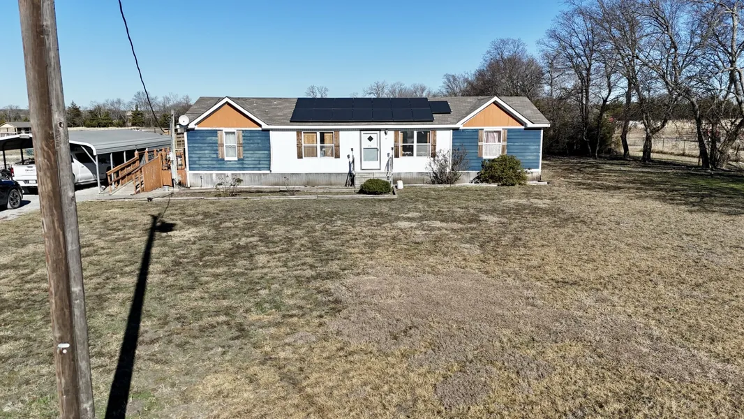 Discover country living with convenient access to town in this spacious three-bedroom, two-bath doublewide situated on 3 acres. Offering two inviting living areas, this home provides flexibility for relaxing, entertaining, or creating a dedicated media or play space. Updated interior and showers with one just needing minor finish out. A formal dining room adds versatility and can easily serve as a home office or study. A wheelchair ramp leads to the side entrance, enhancing accessibility and ease of use. Outside, the property is designed for both practicality and enjoyment. A two-car carport with an attached storage area—complete with an overhead door—offers ample space for tools, equipment, or hobby items. The acreage is level and open, making it ideal for gardening, recreation, livestock or future additions. For outdoor fun, a spot for an above-ground pool is already in place, complete with a deck. A covered patio provides the perfect setting for gatherings, grilling, or even building out your dream outdoor kitchen. Located just off Highway 121, this property offers an easy commute in all directions while still delivering the privacy and freedom of country living. A great opportunity to enjoy space, comfort, and convenience all in one.