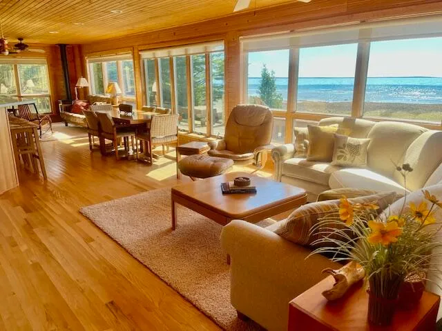 An exceptional, fully furnished cottage with a gorgeous full span view of the Mackinac Bridge, magnificent sunsets, and the south shore of Round Island. With180' of water frontage right out your door making this your perfect up north getaway on Bois Blanc Is., MI overlooking the Straits of Mackinac. This newly remodeled home has a large first floor, waterfront master suite with a fireplace and 2 additional downstairs bedrooms on the other side with a full bath. The open floor plan brings lots of light and nature into the home which includes a waterfront sunporch and an upstairs suite with another full bath. The newly reroofed and sided pole barn holds all the toys you'll want to have and is also coming with tools, mower, 2 kayaks, gas grill and various other island necessities The move-in ready cottage with hardwood floors and lots of storage also comes with everything you see in the pho...