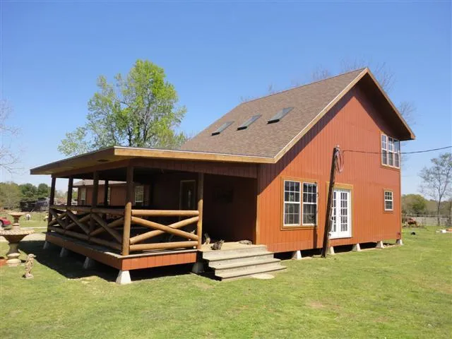 Spacious Western Style home on approx 3 acres. The exterior of cabin is finished but the interior is unfinished (about 60% completed.) House offers an open floor plan with the highest peek of the ceiling measuring 28 feet. The home is located on Topeka Jayess Road and offers a Large front porch, loft overlooking den, gated entrance, and a private setting. The house plans call for 3 BR 3 BA. Additional acreage available.