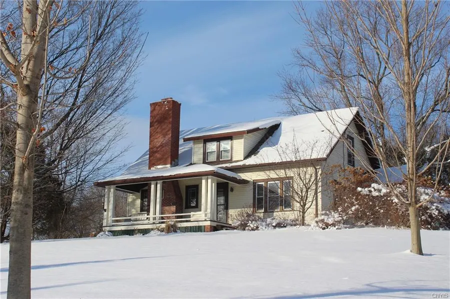You will appreciate the picture-perfect 3-acre Currier and Ives setting of this home. The rocker ready front porch is ideal for enjoying magnificent CNY countryside views. You can say goodbye to neighbors; there are no other homes in sight. The two outbuildings offer plenty of room for extra cars and recreational vehicles. When you enter you are greeted by hardwood floors, classic glass door handles and turn of the century molding. The woodburning fireplace is bordered by original scones that add to the personality of this home. The formal dining room boasts 2 corner built-in cabinets and leads to the eat-in kitchen which features solid surface counters and updated cabinetry and fixtures. The first-floor bedroom and full bath mean one floor living is an option. There is also a full bath on the second floor along with two additional bedrooms. Stairway access to the attic offers plenty of storage space with easy access. Improvements include new boiler, roof, remodeled bath and kitchen, comfort windows, patio, and much more. The picturesque pine trees bordering the property complete the picture. Location is ideal - less than 10 minutes from Baldwinsville and Camilluss Township 5.