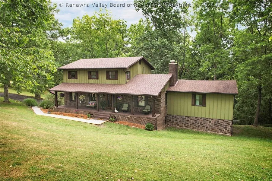 This cozy 5-bedroom (2 primary suites), 4.5-bath home is nestled on 3 wooded acres in the serene Teays Farms Nbhd. The main floor primary suite features vaulted bedroom ceilings, hand-scraped hardwoods, a luxurious bathroom with high-end finishes, and a private balcony. The updated kitchen boasts custom Kraftmaid cabinetry, copper farm sink, and crazy horse granite, leading to a large eat-in dining room. Enjoy treehouse views from the covered deck ideal for working from home or relaxing. Family and rec rooms have wood-burning fireplaces and deck/patio access. The cedar barn door opens to the finished basement with a laundry room, full bath & storage area. New roof in 2019, two HVAC units replaced in 2021 and 2019.