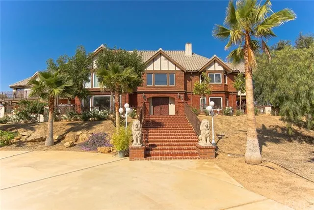Views, Views, Views!!! Welcome home! This Custom Corona Estate Home features over 5,000 square feet, 4 bedrooms, 6 bathrooms, zoned horse property, guest quarters with separate entrance, 3 acres, city lights/golf course/mountain views, circular driveway, custom fountains, custom patios and balcony, wrought iron and blockwall fencing, dual staircase at the entry and spiral staircase at the rear of house, tile/marble/stone/travertine and carpet flooring, upgraded windows, custom interior wood paneling, custom kitchen with upgraded cabinets, granite counters, wet bar, walk in pantry, upgraded appliances, and brick stove/oven, plantation shutters, skylights, walk in closets, dual sided fireplace in living room, media room garage conversion, upstairs laundry room and separate 2nd laundry area, 3 car attached garage, in ground pool and spa, solar panels for energy efficiency, fruit trees, fully gated lot with RV access/parking, no Mello Roos or HOA and so much more!