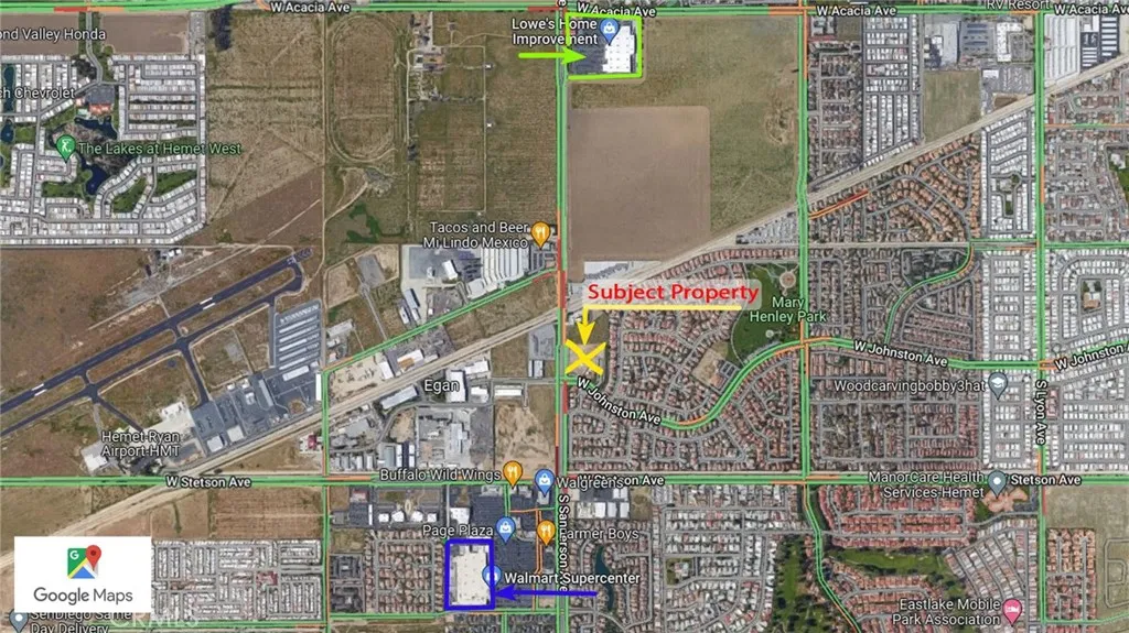 Major Commercial Corner, approx 3 acres. 4-way Signalized Intersection with frontage on major thoroughfare between Beaumont - Hemet- Temecula. Located on Sanderson w/ Super Walmart a block South and Lowes 2 blocks to the North. Buyer to do do a parcel map and split off unused acreage belonging to religious facility. Currently entire parcel with church building is 4.8 acres. Buyer to purchase approximately 2.5-3.5 acres for their own commercial development at $9.00/sqft. The future two parcels will share access rights. Very close to Hemet Ryan Airport and high growth area on West side of Hemet. A few blocks from Domenigoni Parkway which leads to Winchester Road and the I-215 freeway to Temecula.