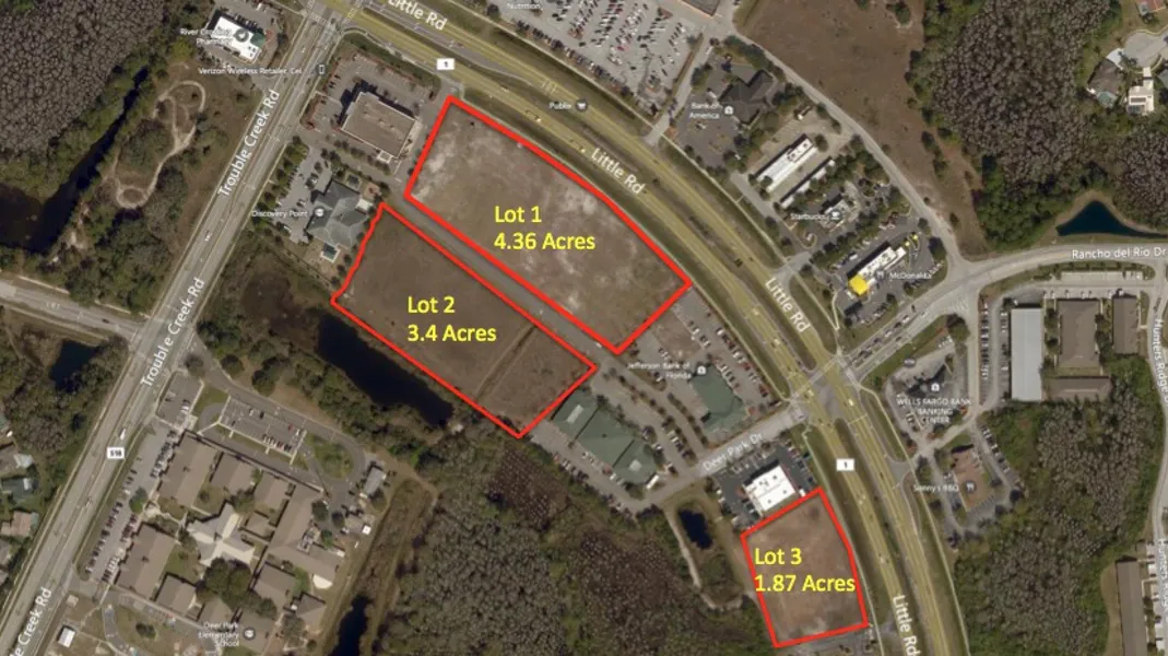 PROPERTY DESCRIPTION Deer Park Commercial offers multiple out parcels available for development ranging from 1.87 acres to 4.36 acres in size. Lot 1 is approximately 4.36 acres fronting on Little Road directly across the street from Publix. Lot 2 is a 3.42 acre parcel located on Deer Park Drive that would be ideal for office, medical, or ALF type uses. Lot 3 is a 1.87 acre parcel fronting on Little Road between a dentist and Tuffy Auto repair. All parcels are mass graded with drainage plans permitted and constructed offsite. Water and sewer are available to all parcels.