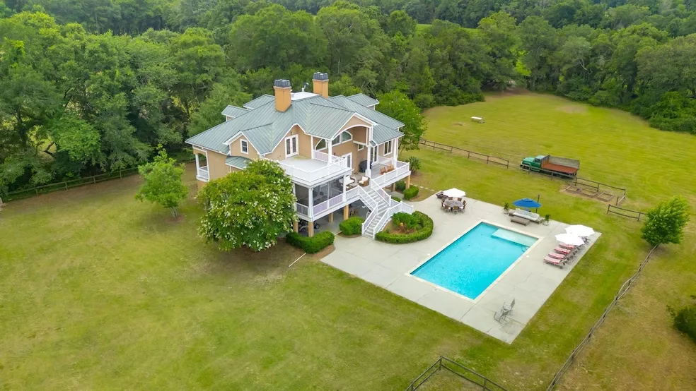 Escape to the Peace and Tranquility of Wadmalaw Island. Welcome to 2470 American Classic Tea Lane, a rare Lowcountry retreat offering the perfect blend of privacy, natural beauty and Southern Charm. Nestled on just over 30 acres across four parcels, this custom-built 3,384 sq ft home was constructed in 2009 to the highest standards and pride of ownership shines throughout. As you pass through the private gate and follow the winding dirt road, you'll be greeted by a serene private pond, setting the stage for everything this stunning estate has to offer. Inside, the home is flooded with natural light, featuring soaring ceilings, open living spaces and incredible views from nearly every room. This is more than a home - it's a legacy property ready for its next chapter. The chef's kitchen is the heart of the main floor, anchored by a focal-point island & a cozy breakfast area. A flexible dining space currently hosts a billiards table and is flanked by custom built-ins. The living room boasts a wall of windows and multiple doors opening to the expansive deck and screened porch, all overlooking the pool, ponds, and wide-open fieldsan entertainer's dream. The primary suite is a showstopper: complete with a gas fireplace, stunning views, and a luxurious bathroom featuring a walk-in shower and jetted tub. For convenience, an elevator shaft is already in place andready for a future install if needed. Upstairs, you'll find three additional primary-sized bedrooms, one with a private ensuite bathroom and a jack & jill bathroom as well, plus a peaceful sitting room for quiet moments. A wet bar leads to a rooftop deck with panoramic views across the landscape. Outside, relax on the front porch with its beautiful wood ceiling, or lounge by the spacious pool while enjoying the quiet beauty that only Wadmalaw Island can offer. Crafted for those who value beauty, space, and peace - this is a retreat to be passed down.