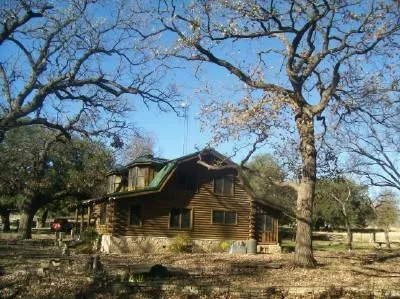 This is a cozy 3 bedroom, 2 bath custom built log home. It is 2 story, has a 3 car garage, large smoke house with smoker,and the largest Burr Oak Trees in Texas.