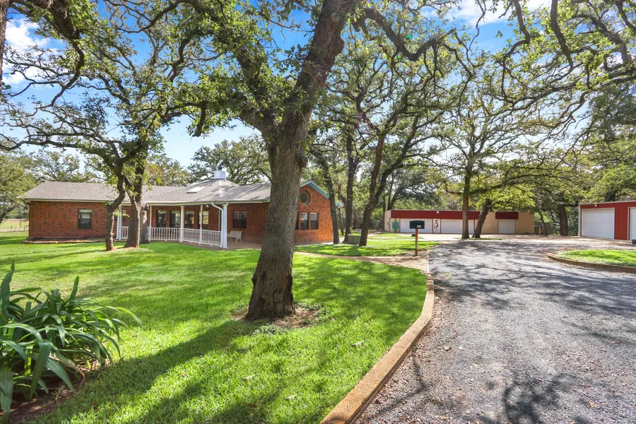 Beautiful 30 acres embraced with Mature Oak Trees and a 2600 sq ft brick home. Home features 3 bedrooms and 2 full baths, built in cabinets, ceiling fans, wet bar with small refrigerator, large spacious kitchen for entertaining, wood burning fireplace (currently has electric logs), two living areas and enclosed patio! Property has water well, full yard sprinkler system, Agricultural Tax Exemption, all fenced, pond, large workshop 40x27, oversized garage with additional shop/storage 44x24 (there is partial concrete tilt walls in this shop), additional septic system. Property goes down to the dry weather creek to the left of the property. Stain glass in the door side lights do not convey, are negotiable.