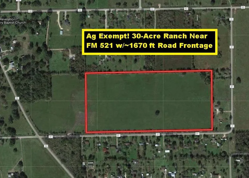 Ag Exempt! 30-Acre Ranch Near FM 521 w/~1670 ft CR 31 Road Frontage! Needs Well/Septic! Low Taxes! Outside City Limits! Minutes to Angleton & TX-288. 25 miles to Proposed Grand Pkwy/TX-99, Pearland Town Ctr, Freeport/Chemical Plants & Gulf Coast Marinas/Beaches. 40 miles to TX Med Ctr & Downtown Houston. Perfect Location w/Great Potential. Can be Commercial, Residential or Mobile Home/RV Park. 15-Acre Tract Also Available For Sale! The Grand Pkwy/TX-99 will be 180+ miles connecting League City-Rosharon-Katy-Tomball-Baytown (See Maps) when done! Perfect Location w/Great Potential. Can be Commercial, Residential or Mobile Home/RV Park. Contact Capital Farm Credit Union for Loan! Acreage, Road Frontage & Property Dimensions Are Estimates! Survey Required!