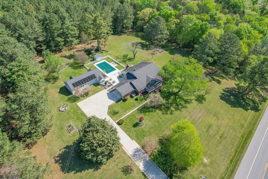 Beautifully unique property on approximately 30 acres with wildlife sighted daily! This 5 bed, 3.5 bath home offers spacious rooms, hardwood & parquet floors, flex space, 2 fireplaces & tons of closets & storage. 3 beds & 2.5 baths on main level. 2 beds, 1 full bath up. Sunroom with tile flooring. In the kitchen you'll find custom cabinetry & Corian counters with center island on wheels. Beautiful landscaping surrounds the home with a fountain, stone landscaping & an 18x36 in-ground pool with solar heating system. Large carport. Detached guest house has a 700 sqft 1 bed, 1 bath cottage with kitchen & living. Large storage area attached to cottage.