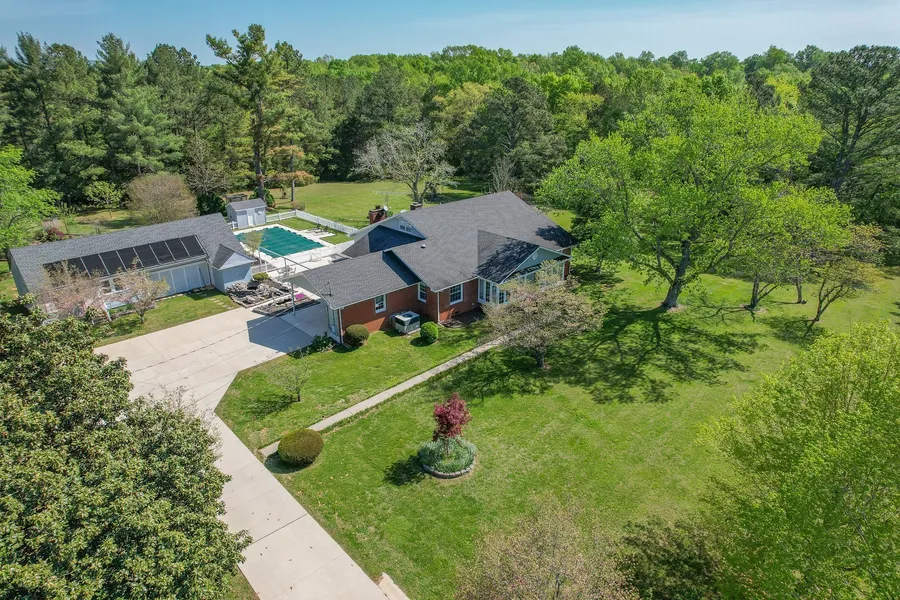Beautifully unique property on approximately 30 acres with wildlife sighted daily! This 5 bed, 3.5 bath home offers spacious rooms, hardwood & parquet floors, flex space, 2 fireplaces & tons of closets & storage. 3 beds & 2.5 baths on main level. 2 beds, 1 full bath up. Sunroom with tile flooring. In the kitchen you'll find custom cabinetry & Corian counters with center island on wheels. Beautiful landscaping surrounds the home with a fountain, stone landscaping & an 18x36 in-ground pool with solar heating system. Large carport. Detached guest house has a 700 sqft 1 bed, 1 bath cottage with kitchen & living. Large storage area attached to cottage.