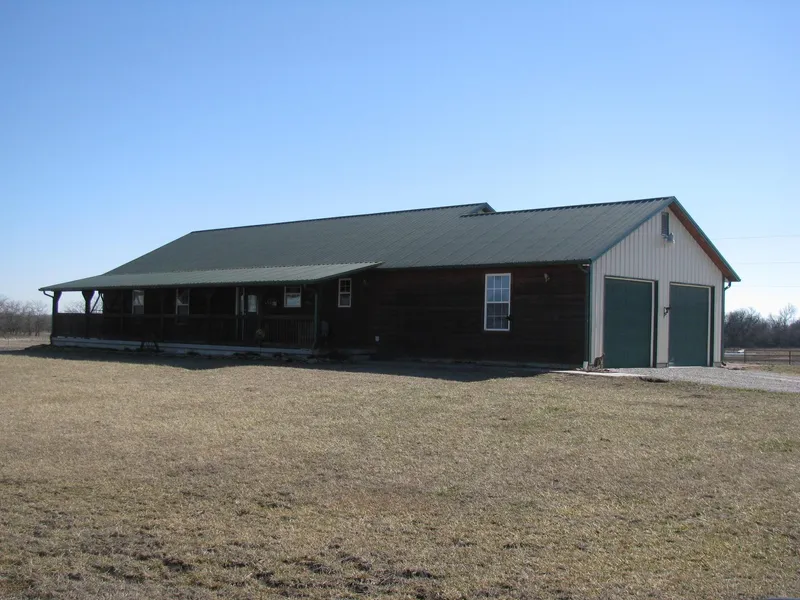 Newer Rustic Ranch Style home on 30 acres, 5 BR, 3 full baths, living room with vaulted ceiling, full finished, walk-up basement, safe room in basement. Metal roof and siding with cedar front, country porch, concrete and brick patio, 2 car attached garage, 30 x 60 barn with 15 ft lean-to, several feet of pipe fencing and pond. Taxes $3,423