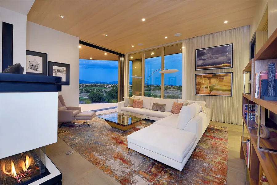 Elegant 2020 Haciendas Parade of Homes Winner, by Tierra Concepts and architect Craig Hoopes, offers a captivating blend of creative comfort and architectural surprises at every turn. This 3-bedroom 3 bath masterpiece commands magnificent views of the Sangre de Cristo, Jemez, and Ortiz mountains. The interplay between intimacy and expansiveness is beautifully executed, with numerous strategically placed windows for breathtaking view corridors. Enter through the custom-crafted steel and glass pivot doors into 12-foot-high living room which opens to a voluminous wrap-around portal overlooking seven holes of the Las Campanas golf courses. The kitchen is a culinary delight with backlit, waterfall Alpine granite countertops, solid walnut cabinetry with soft-touch drawers, Miele appliances, and Subzero refrigerator. Celestial skylights overhead add a touch of wonder. Luxury primary suite with fireplace, asymmetrical backlit bookshelves, linen-covered wall panels, silk padded headboard, bathroom with dual-headed shower, soaking tub, and towel heating bar. Second suite, divided by walnut sliding pocket doors, offers flexibility as either a two-room guest suite or a guest room and studio. In addition, there is a third bedroom/office. Miniature gardens and a four-season bubbling brook. Landscaping by Serquis + Associates. Solar and 240-volt wiring in the oversized garage. Designed for the discerning homebuyer, this home is in the heart of the desirable Park Estates in Las Campanas.