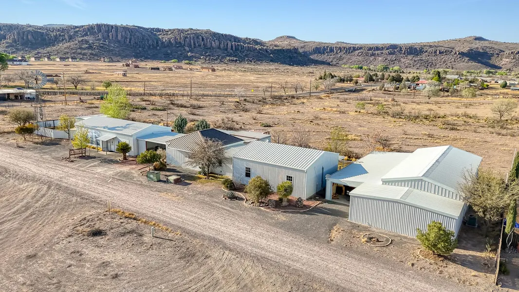 Rare opportunity! This residential/commercial property including out buildings situated on 0.59 acres features steel-frame, insulated construction. A 1900 sqft 2 bed, 2 bath residence with tile floors and a spacious kitchen. A sequestered area with a bath, kitchenette, and den could be a guest suite/office. Featuring a 1163 sqft heated/cooled multi-purpose building, 2679 sqft garage/shop, a greenhouse, and 8500 gallons of irrigation catchment tanks. Stunning mountain views make this a must-see!