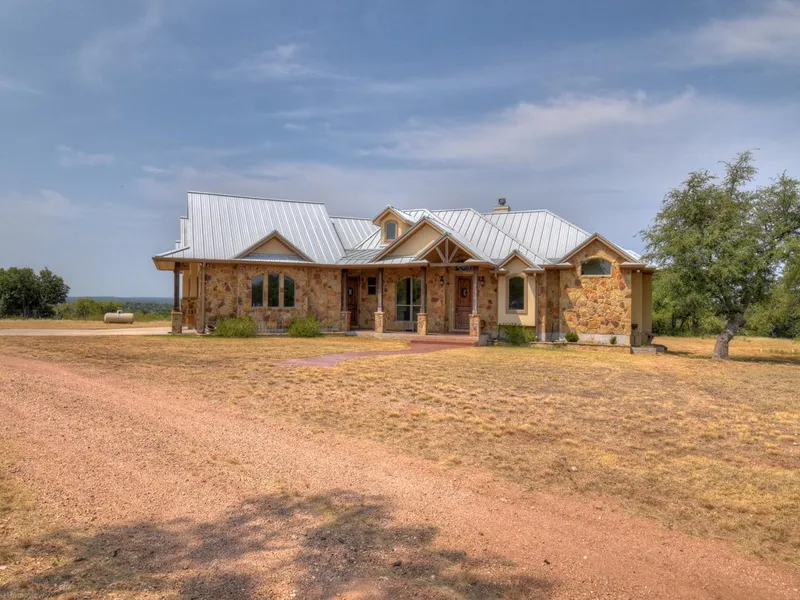 Deep in the Heart of Texas lies this beautiful 3/2.5, 2760 sq. ft. rustic yet elegant home on 304 +/- acres. Sitting on a high spot, the views are spectacular w/ breathtaking sunsets. Notice the stamped & stained stone & wood grain concrete entrance as you make your way to the rustic tall wood front door. Upon entering, your eyes will be drawn to the high ceilings & wall of windows that take advantage of the view. This home has a office to the right upon entry to the home. The master is situated just past the office to the right. Check out the grand master bathroom. Large double door shower, jacuzzi tub, arched bead board ceiling and two walk in closets. The master has its own door out to the patio. In the center of the home is a formal living area with wood burning fireplace, an open kitchen with huge island and a family room off the kitchen area. High end appliances including an ice ma...