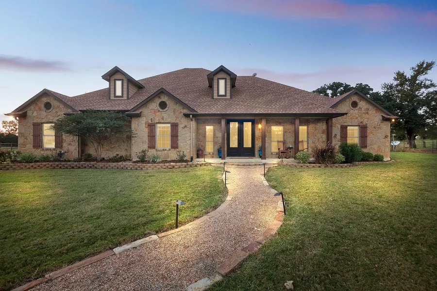 Spectacular Ranch/Resort custom built stone home on 10.8 rolling acres minutes to Austin and ABIA! Enjoy views of wildlife from your front porch overlooking meticulous kept landscaping with lighting and over 40 large oaks. Home features open, mother-in-law floor plan with stained concrete floors throughout. Chefs kitchen with stone walled gas cooktop, stunning granite counter tops with breakfast bar, walk-in pantry. Private Texas size master suite, jetted tub, stone/rock shower w/double shower heads, 200 SF closet/dressing room! 2 large secondary bedrooms w/private vanities. 4th bedroom w/private bath and game room and serves as pool/guest house. 750 SF attic space ready for finish out. Resort style heated pool & spa w/waterfall, swim up bar, sunken cabana and pull-down projection screen for movies. Large private backyard with fenced in garden and fruit tree area. Enjoy stunning sunsets ...