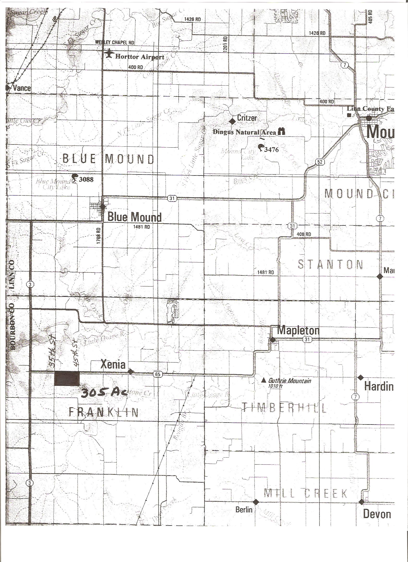 All around property, 305 acres, with an excellent area to hunt, has the potential of up to 250 acres that could be tillable, most of the property in grass now, has a lot of income possibilities, like new perimeter fence, has a mile of blacktop frontage, would make an excellent place to build a home.