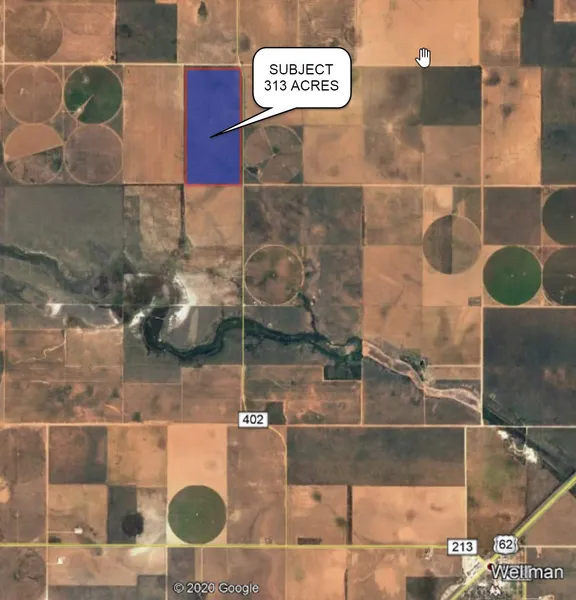 313 acres in Terry County, TX. Good water in the area according to the South Plains Underground Water District. Flat, lays well. 3-phase electricity in the southeast corner. Convenient to Hwy 62, just north of Wellman, TX. No wells, has been kept in dryland status.