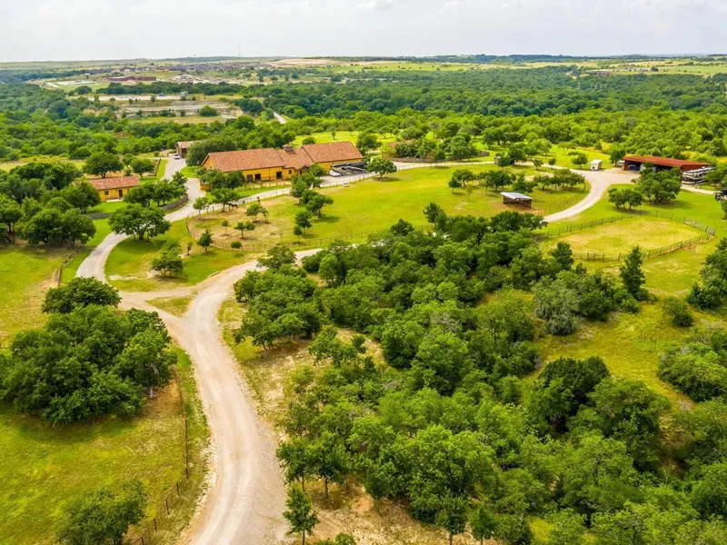 Just on the outskirts of Fort Worth lies this extrordinary 50-acres. The 11 pastures have been thoughtfully placed. All of them are fully pipe-fenced and watered. The natural beauty of the property is impressive. A small canyon crosses through the middle, and at the back flows Live Oak Creek where tons of local wildlife make their home. The barn is a horse owners dream and has a separate entrance from the main residence. The 8 oversized stalls all have 30' runs on the back and open into the extra-wide barn alley with a rubber-tiled floor. The tack room has a saddle closet that is conveniently accessed by an automatic overhead door from the barn alley. There is a large utility room/kitchen, office, bathroom, and shop. Also in the barn are two interior bays where you can park a full-sized motor coach and a large horse trailer with living quarters.