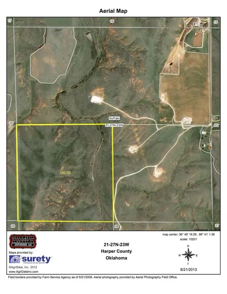 This 320 +/- acres of land lies approx. 5 miles SW of Buffalo, OK. It is comprised of mostly native grasses and is all under one fence. Access to the property is from the south and fairly remote. There is a creek along the east and northeast side of the property as well as a water well that may provide water for livestock and/or wildlife. This pasture has not been grazed in several years and has a good stand of grass currently growing on it. Order of Auction: Land will be sold as one tract. Legal: SW/4 of 21-27-23 and the NW/4 of 28-27-23, Harper Co., OK Minerals: Do not sell. Possession: Will be given upon payment in full of the purchase price and transfer of title, at closing. 2012 Taxes: were approx. $147.00. The 2013 taxes will be prorated to the day of closing. Terms: 10% of the purchase price is to be placed in escrow the day of the auction with the balance being due upon delivery of merchantable title. All information is taken from sources believed to be reliable; however, no guarantee is made by the auction company or its employer. Buyers should satisfy themselves as to acreage, crop base, etc. prior to auction day. Any announcements made the day of the auction supersede all advertising.