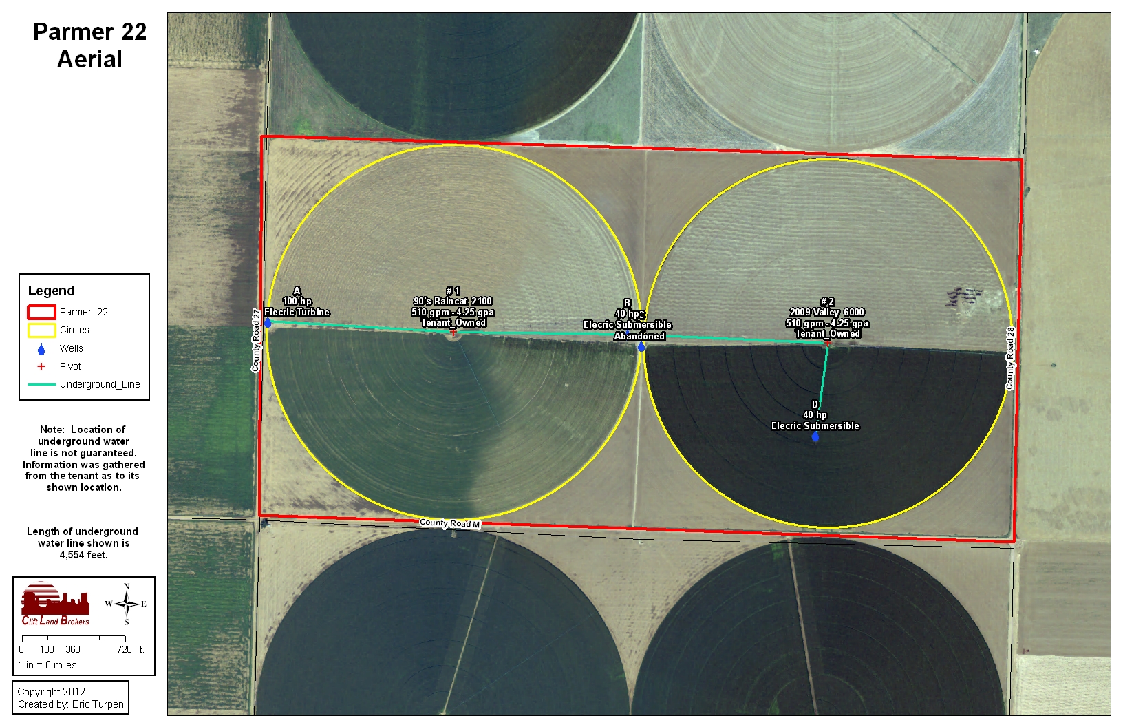 There are three operational wells and one well with a pump stuck in the hole. All wells are tied together. The tenant reports that each sprinkler is nozzled at 510 gpm, with only one system running at a time. There is a booster pump at each pivot.