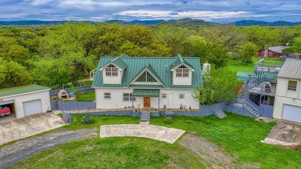 High-quality craftsmanship is apparent in the distinctive interior that blends traditional architecture with a modern open concept floor plan. Tall ceilings, hardwood floors,tile counters & custom knotty alder design finishes run throughout. Gourmet kitchen has expansive island, pantry, & a professional chef's gas range. Gas log fireplace in LR, & indoor pool and recreation area with fireplace, & outdoor pizza oven! Guest home with its own patio & sunset deck. 3 car detached garage (w/ 2 showers & A/C) for the main house has a workshop and storerooms. Smoke free, high optic internet, soundproof (8" thick walls) In Frio Cielo Ranch, there's free water, complete access to both sides of the river and common areas, lookout area on hillside, horse pastures, and a volunteer fire department.