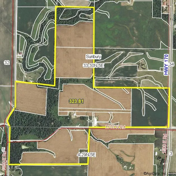 323 total acres, approximately 215 tillable, 90 acres of woods, registered air strip, ponds, single family home, 70x200 machine shed large enough for an airplane. Tons of wildlife, large trees, creek, all this just about 90 miles south of Chicago and about 8 miles from I55!