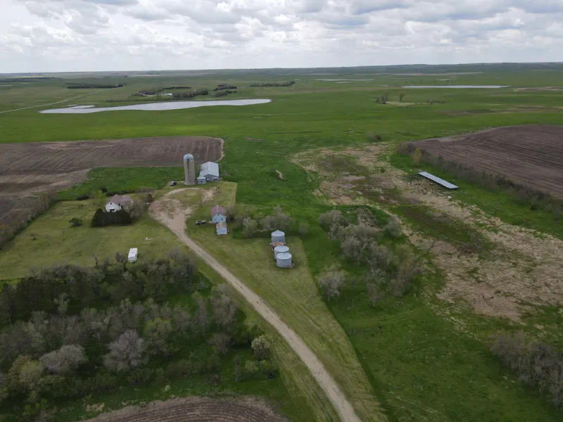 The homesite includes a large steel barn, silo, grain bins and two outbuildings, along with many mature tree rows and shelterbelts with habitat for wildlife.