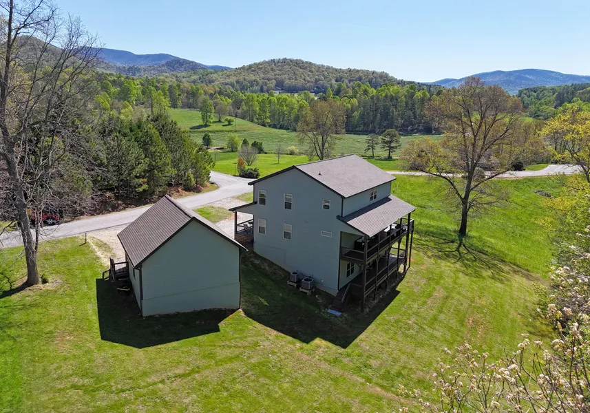 M. Gorgeous mix of Sheetrock and wood. Fireplace set up for Gas Logs (not included). Oversized Dormer and architectural interest with feature windows near loft. Main floor has open bayed dining area, Granite countertops and Samsung Black Stainless appliances. Large Apron Sink, lots of cabinets. Primary Bedroom is suitable for King-sized furniture. Lots of natural light. Bath w/ dbl van, Nice Shower. Half bath off the hall for guests. Laundry room on main as well. Back Covered Porch is perfect for BBQing. Upper floor has another owner suite, again very large for big furniture, MASSIVE open loft for overflow guests, office space, game-room or whatever you can imagine. Lower level features Den, full bath, 2 Bedrooms, and access to the lower deck. 24x24 garage. Just under 1 acre of gently sloping land. Located Deep in the heart of Trackrock. Under 10 miles to town. Pride of Ownership abounds. Beautifully appointed. Hard-plank siding.