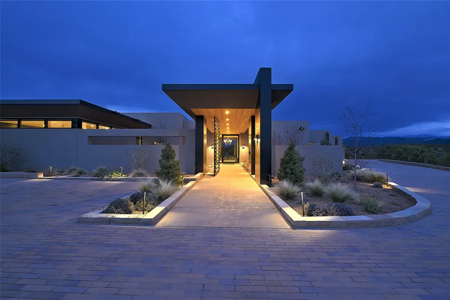 Monte Sereno Masterpiece. Sculpted by builder Kim Dressel and architect Rad Acton from cutting edge contemporary building materials, glass, and stone, the East-Facing classic one-level home delivers on every level - starting the enormous views of the Sangre de Cristo Mountains to the east and the Badlands to the north. Enter through a private gate to the motor court with pavers, then the pivot gate & private garden - to a view sequence matched by few other properties in all of Santa Fe. Completed in 2022, the soaring ceilings and walls of glass are complemented by a wonderful open floor plan which meshes the living room/dining room/kitchen/wine bar into one graceful glowing space. Top-of-the-line appliance package and views galore make the kitchen a true centerpiece of the home, with a full butler's pantry and cozy banco seating area. The media room/office area are state-of-the art on every level, with an oversized TV screen and partitioning for privacy. The outdoor portal space retains the high ceilings, and the space is replete with a pool/spa feature that is fully programmable, a well equipped outdoor kitchen, and in ceiling radiant heaters to take the edge off Santa Fe's cool evenings while taking in the views. The primary suite is cloistered away from the rest of the home and enjoys spectacular views and a luxurious bathroom suite and separate closets. The other bedrooms all enjoy the same views and ensuite baths. There is a separate exercise room on the south end of the home which also retains the views and lots of sunlight - could also be a great artist's studio.