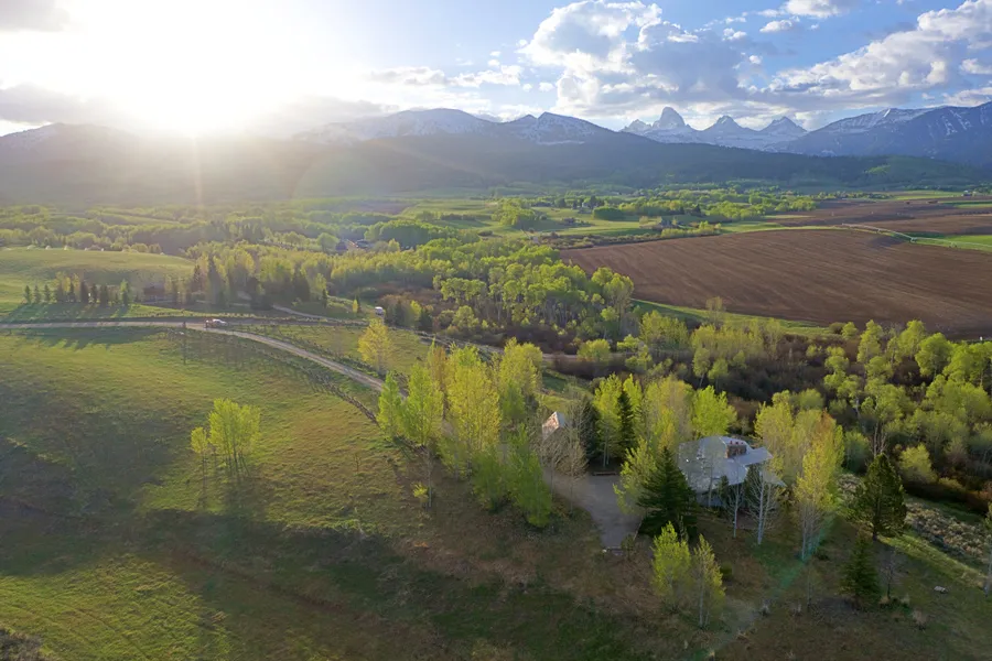 Dry Creek Retreat - Located on the state line between ID and WY, 6.5-miles northeast of Driggs, ID and just 5-minutes from National Forest access. The rolling 33.26-acre property is divided almost equally between upland pasture and a treed hillside leading to a riparian creek bottom. The 1,968 square foot, 2-bedroom, 1 1/2-bathroom home was constructed in 1989 and features large south-facing windows, great room, large central fireplace, formal dining area and in-floor hydronic heat. The home is sited in the middle of the property, overlooking Dry Creek, on a south-facing hillside with dramatic views of the Grand Teton and sweeping views of the Teton Valley.