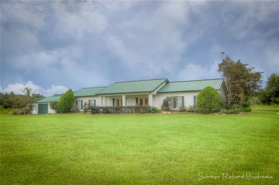 Sturdy steel construction with custom woodwork interior. Open living area floor plan with stained concrete floors and carpet in 3 bedrooms each having its own bathroom 33 acres surrounded by trees and plenty of covered parking for cars, trucks, boats and campers.
