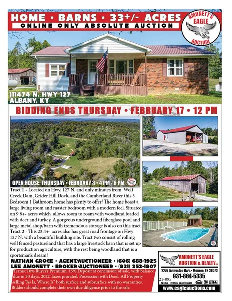 This 23.4+- acres also has great road frontage on Hwy 127 N. with a beautiful building site. Tract two consist of rolling well fenced pastureland that has a large livestock barn that is set up for production agriculture, with the rest being woodland that is a sportsmans dream!