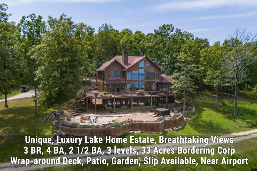 Unique Luxury Lake Home Estate, 33 AC M/L bordering Corp. 4,990+ sf Custom Home built in 2012, 3 BR, 4 Full, 2 Half Baths, 3 levels, gorgeous views from every room, high end appointments & finishes. Living area features amazing wall of windows overlooking Bull Shoals Lake. Stone fireplace & hardwood floors give the cozy feel of a lake retreat. Open country kitchen w/island & bar, gorgeous wood cabinets, granite counters & high-end stainless appliances. Just off kitchen is lovely fully screened porch. Many doors throughout home access wrap-around deck w/plenty of room to enjoy outdoor living. Large primary bedroom suite w/spacious walk-in closet & private full bath. Upper level has bedroom & studio (both could be bedrooms) & full bath. Lower level has large family room w/gorgeous lake views, 2nd bedroom suite w/walk-in closet & full bath. Lower level rooms have access to wrap-around covered patio & stunning lake views. Near private airport. Hanger, plane & dock available separately
