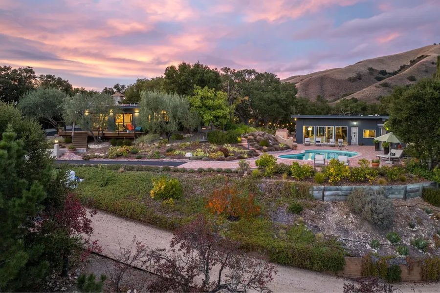 Discover privacy and tranquility in this extraordinary single level mid-century retreat surrounded by natures beauty. Completely remodeled in 2021 the house enjoys an open floor plan filled with natural light and walls of glass that seamlessly connect indoor and outdoor spaces perfect for enjoying breathtaking panoramic vistas of the Santa Lucia Mountains. The enchanting grounds include a private south-facing courtyard with sparkling pool; ample seating areas; patios, and a dramatic stone fireplace. Meandering paths lead to a full size bocce ball court with purpose built seating; and 750 sq. ft detached multi-purpose barn/studio currently used as a spacious gym. There is tons of storage and parking, and several outbuildings. This property enjoys dramatic sculptural oaks together with drought tolerant landscaping, an orchard and multiple large raised beds. Sustainability is a highlight with a private well plus water collection tanks together with extensive solar panelling and an EV charger. A spacious guest house with underfloor heating and private deck completes the picture. This home offers a rare lifestyle of serenity and endless possibilities. Come and experience its charm and beauty for yourself.