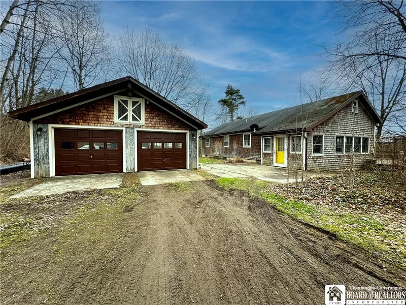 Welcome to this secluded ranch home in the Bemus Point School District. Heading up a long winding driveway you will approach the cedar sided home & two car garage. The home features a large double deck across the front of the house over looking the lake through the trees. It is situated on over 3 acres with perennial gardens surrounding the house. Entering the house, you walk into a large sunroom with ample windows. The kitchen, dining and living room offers a modern open concept, yet maintained a cozy, warm and homy feeling. Large picture windows and a siding glass door brings the outside in. The primary bedroom as been opened up to the living room, but could easily closed back up again if desired. It offers a sliding glass door off the side of the house to the main yard. There's a second bedroom and a large bathroom off the great room.The house is easy to move around and offers few steps. The full basement stays dry and could easily be finished if desired.There is also the cutest garden shed/ playhouse that comes along with the property. House and property come "as is where as" Delayed showing begin April 1st, negotiations set for April 8, 2024 at 6:00pm
