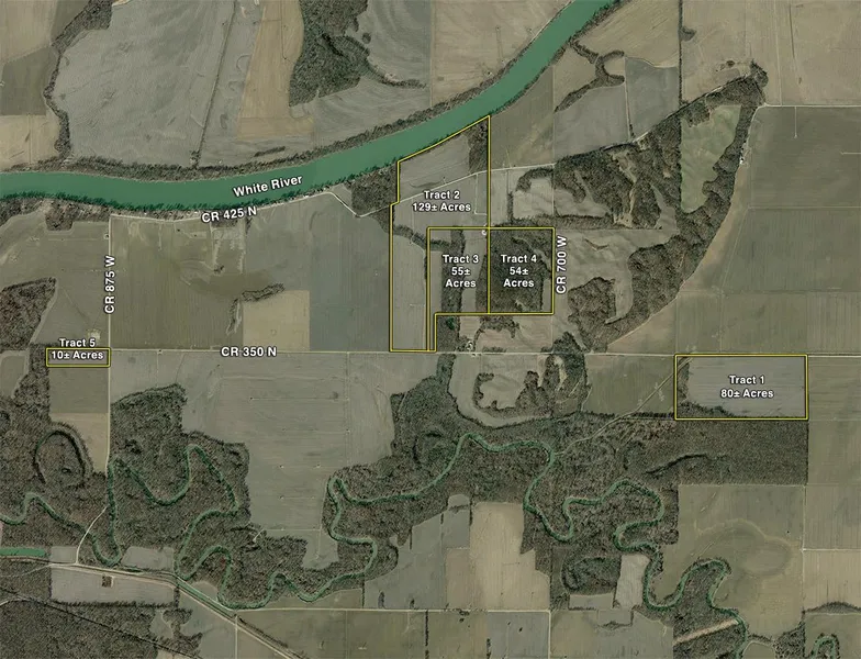 Tract 2: 129 ac; mostly tillable; fronting White River