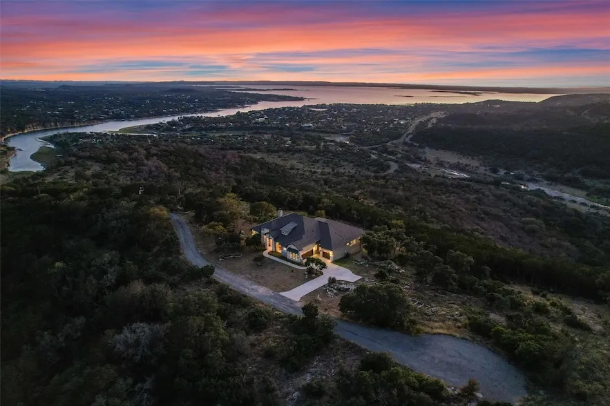 **Subdivision available. Contact for more details.**Welcome to this magnificent custom-built estate, situated on 34.12 acres in the heart of the Texas Hill Country. This property boasts stunning panoramic views of the lake and rolling hills from nearly every room. Designed for luxury and comfort, the home features four private bedroom suites and a half bath.**Owner Suite**Your personal sanctuary awaits with awe-inspiring views of the countryside and lake. The en-suite bathroom offers a jetted soaking tub, dual vanities with quartz countertops, a walk-in shower adorned with marble tile, and a custom walk-in closet.**Living and Dining Spaces**At the heart of the home is a grand living room with a stone fireplace, perfect for relaxing or entertaining. Expansive windows provide uninterrupted views of the Hill Country lake and sunset. Adjacent is the formal dining room, ideal for hosting dinn...