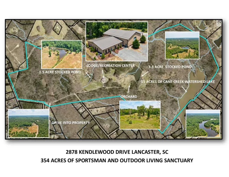 Whether a personal retreat, permanent residence or business venture this estate has endless opportunities for lifestyle activities. Hunting, fishing, ATVing & trail riding w/the convenience of nearby Waxhaw, Indian Land & Charlotte. An abundance of Whitetail deer, turkey, dove & duck. 2 large, spring-fed ponds, & a majority of 20-acre Cane Creek Reservoir, 30 cleared acres, orchard & 5 fenced pastures within a perimeter fence. 5 wells (county water available). Estate focal point is a custom-built sportsmans lodge w/large (5,463sf) activity center, 1,520sf garage & shop, 2 ATV/equipment storage areas, game processing rm w/walk-in freezer & 2 stalls w/fenced paddock. Completing this extraordinary facility is a 2,652sf wheelchair friendly apartment, w/gourmet kitchen, dining & great rm. Wood grain tile floors, custom cabinetry/leathered granite counters, tongue & groove ceiling in kitchen,...