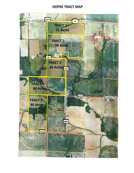 349 +/- Acres in Twp. 51N, R5W, Sections 14, 15 & 22 in Audrain County MO. To be offered in 5 tracts ranging from 40 acres to 98 acres, all with either highway or county road access.