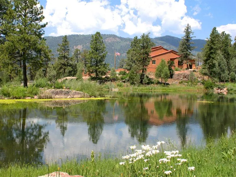 Looking across the north Animas River Valley, this very private and secure 35-acre property features a lake, waterfall and pond, year-round creek and expansive views. It has a remarkable Hacienda style home, designed and built for Don Becket, a work-renowned architect and developer, with 7,800+SF, 4 bedroom suites and 5 baths and was constructed by the finest craftsmen from the area, creating a sanctuary that fits seamlessly into the surrounding environment resplendent with woodlands and rock outcroppings. The estate includes an impressive array of luxury features and is surrounded by natural beauty of the San Juan national forest and exclusive Celadon gated community and its wonderful amenities.