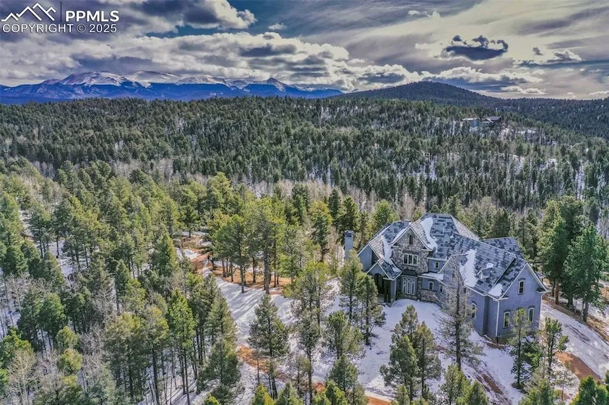 Exquisite French Provincial styled home situated on 35 acres, w/ mountain & Pikes Peak views! Expansive living room complete w/ 20 ft. ceilings canopied w/ windows, chiseled marble gas fireplace dual sided to the owners suite, the upper level loft overlooking this space. A Chef s kitchen designed w/ solid surface recycled countertops, custom cabinetry, Thermador 6 burner glass induction cooktop, built-in wine rack & plate rack. Gorgeous morning room is adjacent the kitchen & is surrounded by windows w/ soaring 20 foot vaulted & beamed ceilings. Main level owners suite includes coffered ceilings, chiseled stone fireplace, adjoining an elegant master bath w/ a hammered copper soaking tub, separate vanities, a large walk-in shower w/ rain head, dual shower heads & massage sprayers, & 2 walk-in closets complete this suite. Main level library includes a stone surround wood-burning fireplace. Laundry additionally located nearby the kitchen, plus a powder room adorned w/ custom 3D mural. Mud room entry for shedding clothing and shoes, & a small nook office space. Custom arched 12 foot wooden/wrought iron front door; 2 elegant stairways w/ wrought iron spindles leading to upstairs; Formal dining room adorned w/ coffered tray ceiling & surrounded by 10 wood columns. The upper level includes 3 bedroom suites, each attached to a bathroom. Suite 1 attaches to a full bath, suite 2 attaches to a Jack & Jill bath, w/ double closets. Suite 3 is designed as a comfortable guest suite, large walk-in closet, & attaches to the Jack & Jill bath. The expansive LL is unfinished, w/ walkout, includes a 3/4 finished bath, a blank canvas to finish addt l living space! UPGRADES INCLUDE: Gold LEED certification; fossilized bamboo wood floors; travertine tile;25000 watt solar panels designed for snow load & high winds; R40 insulation; SIP panel construction; triple pane argon gas windows; 2 geothermal pump systems for heat & A/C;10 to 20 foot ceilings; Don t miss the 750 sf storage bldg.