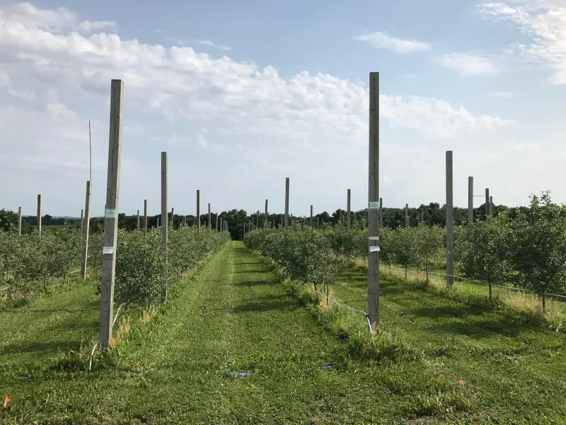 Apple Tree Varieties by sections planted: Dandee Red 185 trees, McIntosh 500 trees, Jonathan 500 trees, HoneyGold 115 trees, Scarlet Spur II 50 trees, Minneiska (SweeTango) 2000 trees, HoneyCrisp 315 trees, HoneyCrisp 766 trees and Zestar 200 trees.