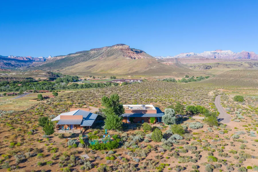 Perched on a 35-acre mesa high above the Virgin River, surrounded by Zion Nat Park & BLM lands, this is an Island in the Sky! Relax on the wrap-around porch of this tastefully custom-built Territorial-style home, while basking in the views of Zion, Kolob, Virgin Mesas & Pine Valley Mtn. Features Saltillo floor tiles, deep window sills, custom woodwork and beautiful artisan tile details make this home a hidden gem.