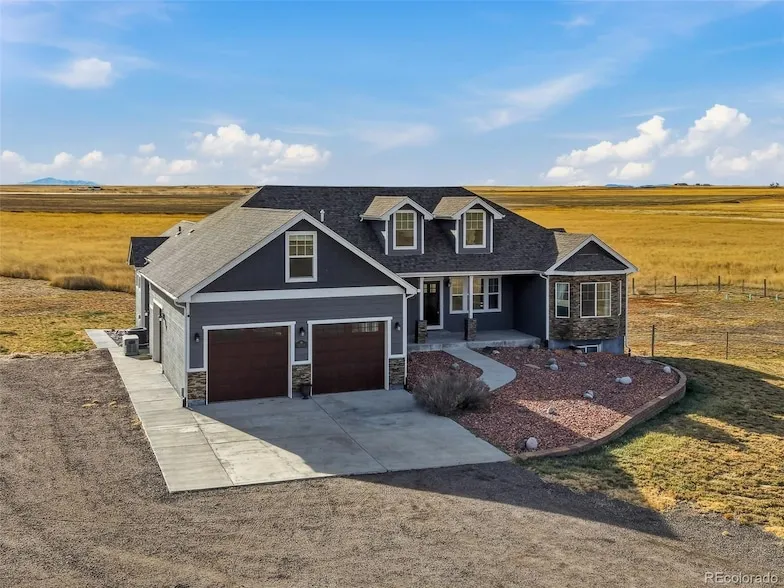 Situated on 40 acres of level, sunlit plains with expansive skies and panoramic distant Rocky Mountain views, this property offers complete privacy with no immediate neighbors ideal for equestrian activities, gardening, raising animals, or pure seclusion. This stunning modern ranch home offers 4 bedrooms and 4 bathrooms across 5,756 total square, featuring soaring vaulted ceilings and expansive windows that flood the interiors with natural light. At the heart of the home is a gourmet kitchen equipped with a large granite island, whitewashed soft-close cabinetry, ZLINE professional stainless range, Bosch appliances, farmhouse sink, and custom tile backsplash perfect for daily meals or entertaining. The luxurious primary suite includes dual walk-in closets and a spa-inspired bathroom with an oversized walk-in shower, rainfall fixture, pebble flooring, and elegant stone and tile finishes. T...