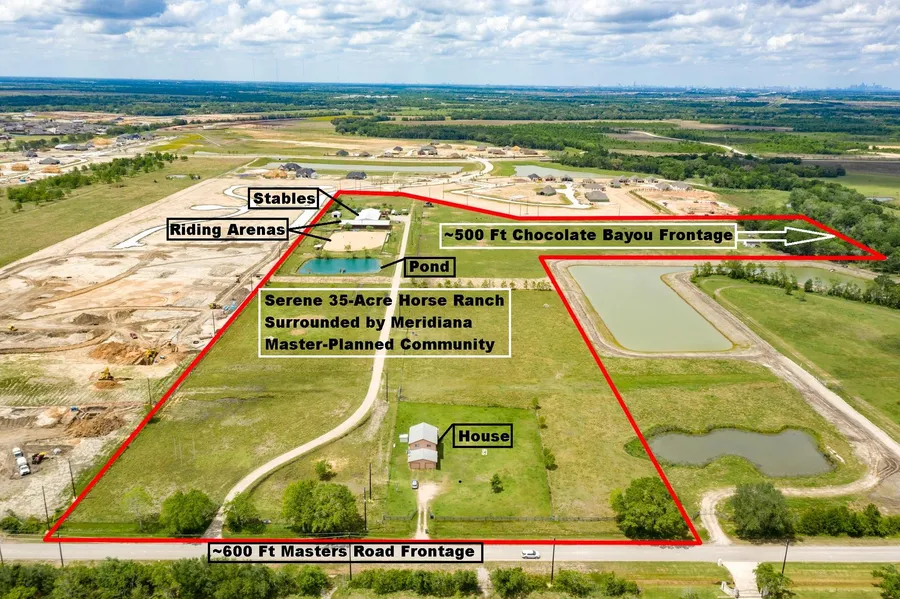 Located in Manvel, this serene 35-Acre Horse Ranch has ~600 Ft of Road Frontage on Masters/CR 67 & ~500 Feet of Water Frontage on Chocolate Bayou. The property will have access to the soon-to-be-completed Cumulus Road. The subject property has been operated as a successful horse boarding, training, and riding school. There is a home, a 32-stall stable with living quarters & cross-fenced pastures. While the improvements are quite usable and can generate income, the propertys true value is in the land. The ranch is surrounded by the new master-planned community of Meridiana. Within the city limits of Manvel, the property is subject to their zoning. The City has indicated a willingness to examine the uses for the property. There is the potential to acquire water and sewer from the neighboring Brazoria County MUD 56. Manvel development is booming and in addition to Meridiana, there are 11 other ongoing or proposed developments in the city limits. Only 10 miles to the Pearland Town Center & 5 miles to the Proposed Manvel Town Center, which will be located on the NW corner of SH 288 & SH 6. Minutes to 2 State Highways (SH 288 & SH 6) provide an easy 22-mile commute to Texas Medical Center & Downtown Houston or a 38-mile drive to the Gulf & Galveston Island Beaches. The property is 26 miles to Texas City, 23 miles to Kemah Boardwalk & 16 Miles to Hobby Airport. The population in a 3-mile radius from the Subject Property had an estimated 2018 population of 35,036 in 11,797 Households. Growth in the 3-mile radius from 2018 to 2023 is projected to be 18.97% with a projected 2023 population of 45,250 in 13,550 Households. The Average Household Income in the 3-mile area is currently $94,551 with a Median Income of $69,791.